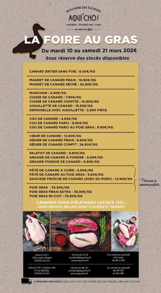 La Foire au Gras AQUI’CHÒ – Printemps 2026 Du 10 au 21 mars 2026 Foie gras, magrets, canard entier, gésiers, pâté à cuire… à prix foire !Pendant notre Foire au Gras, retrouvez les saveurs emblématiques du Gers, issues directement des élevages de nos producteurs à Saint-Médard, Belloc-Saint-Clamens et Marsan. Pour être sûr d’avoir vos produits […]