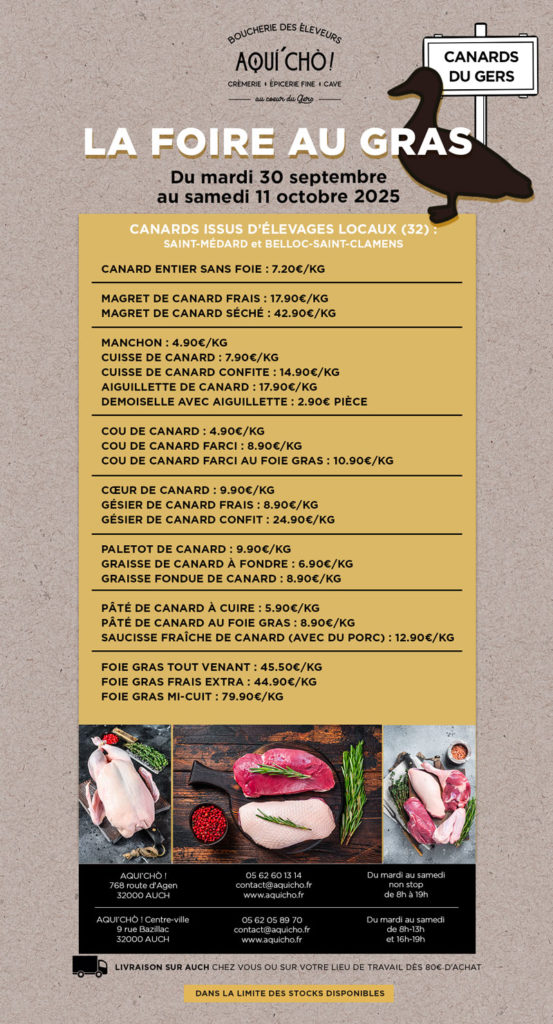 La Foire au Gras AQUI’CHÒ – Automne 2025 Du 30 septembre au 11 octobre 2025 Foie gras, magrets, confits, gésiers… les saveurs emblématiques de notre Gers vous attendent lors de notre Foire au Gras. Nos canards viennent directement d’élevages de nos producteurs gersois de Saint-Médard et de Belloc-Saint-Clamens. Pour être sûr d’avoir vos produits préférés, […]